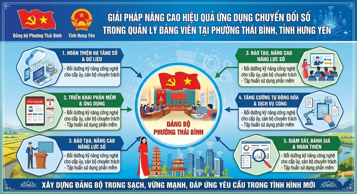 Để thực hiện thắng lợi các mục tiêu về cải cách hành chính trong Đảng và tháo gỡ những "điểm nghẽn" sau khi sáp nhập, Đảng bộ phường Thái Bình cần thực hiện một lộ trình chuyển đổi số bài bản, có trọng tâm, trọng điểm với các nhóm giải pháp sau: