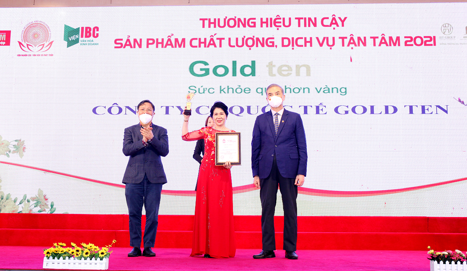 Bà Lê Minh Ngọc - Tổng Giám đốc Công ty CP Quốc tế Goldten nhận cúp, chứng nhận Top 10 “Thương hiệu tin cậy - Sản phẩm chất lượng - Dịch vụ tận tâm” năm 2021
