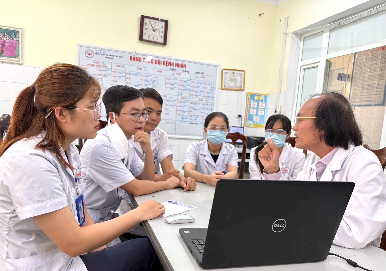GS.TS. Nguyễn Tiến Dũng trực tiếp trao đổi, hướng dẫn chuyên môn cho đội ngũ cán bộ bác sĩ trẻ tại Bệnh viện Đa khoa Vân Đình, Hà Nội.