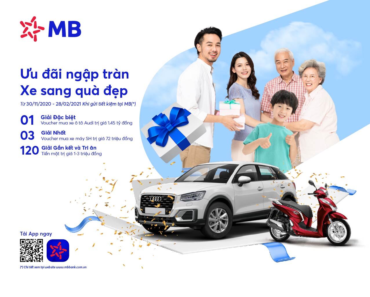 Với 10 triệu đồng gửi tiết kiệm kỳ hạn 1 tháng trở lên trong Chương trình khuyến mãi "Ưu đãi ngập tràn - Xe sang quà đẹp" tại các chi nhánh, phòng giao dịch trên toàn quốc hoặc qua ứng dụng ngân hàng số App MBBank của Ngân hàng Quân Đội (MB), khách hàng sẽ có cơ hội trúng thưởng ô tô Audi hoặc xe máy Honda SH cùng nhiều phần quà là tiền mặt.