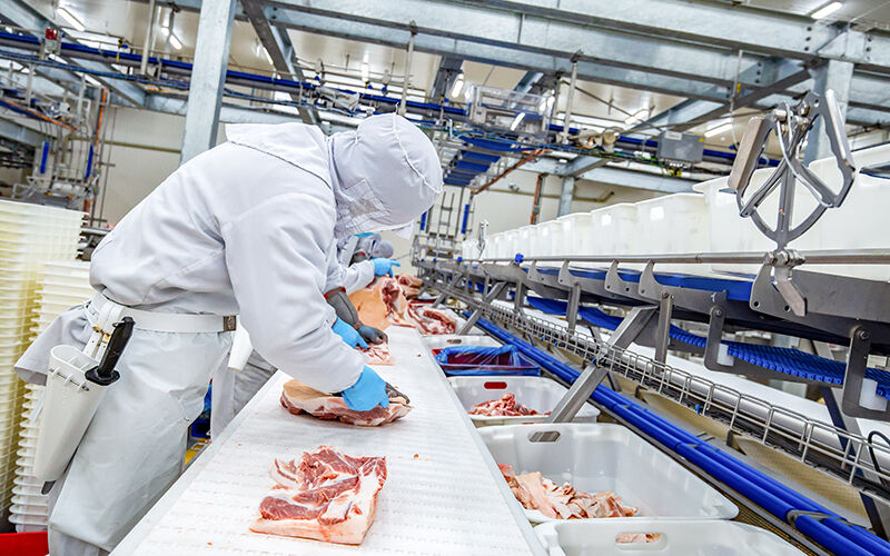 Công nhân Nhà máy chế biến thịt Masan vận hành dây chuyền đóng gói thịt.