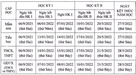 Thời gian kết thúc học kỳ I trước ngày 16/1/2022, hoàn thành kế hoạch giáo dục học kỳ II trước ngày 25/5/2022 và kết thúc năm học trước ngày 31/5/2022.