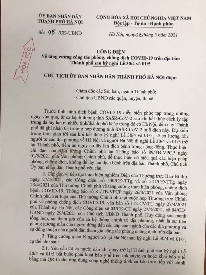 Ngày 02/5, Chủ tịch UBND Thành phố Chu Ngọc Anh đã ký ban hành Công điện số 05/CĐ-UBND về việc tăng cường công tác phòng, chống dịch Covid-19 trên địa bàn Thành phố sau kỳ nghỉ Lễ 30/4 và 01/5.