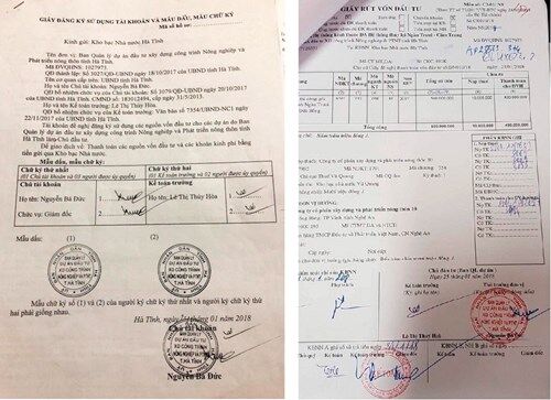 Điển hình, tại “Giấy rút vốn đầu tư” thi công DA hệ thống thủy lợi Ngàn Trươi – Cẩm Trang, do Kho bạc Nhà nước Hà Tĩnh lập, giải ngân số tiền 500 triệu đồng vào ngày 31/1/2018, tại mục Chủ đầu tư BQL dự án ký, đóng dấu, bà Lê Thị Thúy Hòa đã điềm nhiên ký nhận ở mục “Kế toán trưởng”?!