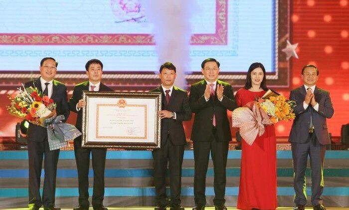 Phó Thủ tướng Chính phủ Vương Đình Huệ, Bí thư Tỉnh ủy Hà Tĩnh Lê Đình Sơn trao bằng công nhận huyện NTM của Thủ tướng Chính phủ cho lãnh đạo huyện Can Lộc.