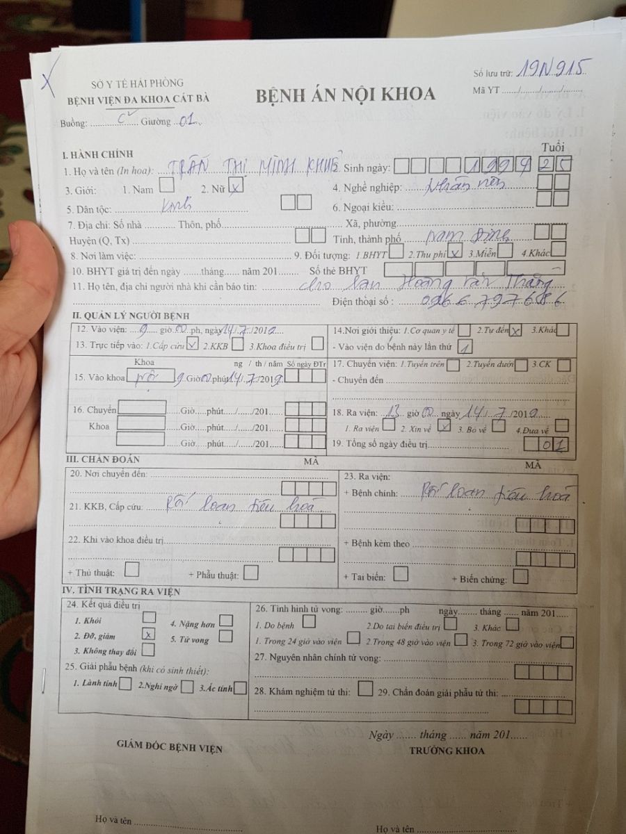 Bệnh án kết luận"Rối loạn tiêu hóa" của một trong hàng chục bệnh nhân cấp cứu được Giám đốc Bệnh viện Đa khoa Cát Bà cung cấp nhưng không có đóng dấu, không có chữ ký xác nhận của Trưởng khoa, Giám đốc bệnh viện