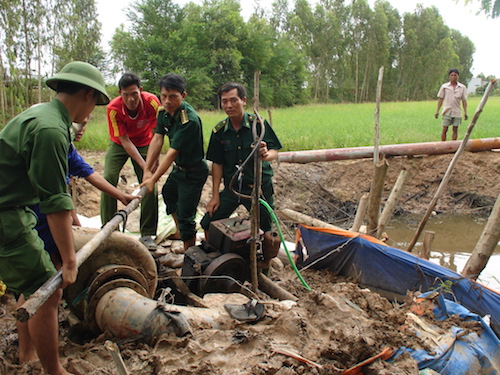 Lực lượng vũ trang huyện đầu nguồn Tân Hưng (Long An) giúp người dân bơm nước cứu diện tích lúa vụ thu đông ngập úng