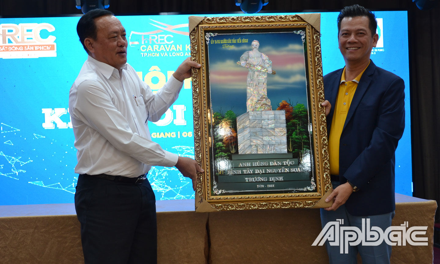Ông Lê Văn Nghĩa - Phó Chủ tịch UBND tỉnh Tiền Giang trao tặng Bức tranh quý "Anh Hùng dân tộc Trương Định" đến ông Nguyễn Quốc Bảo - Chủ tịch HREC. (Ảnh: Báo Ấp Bắc)