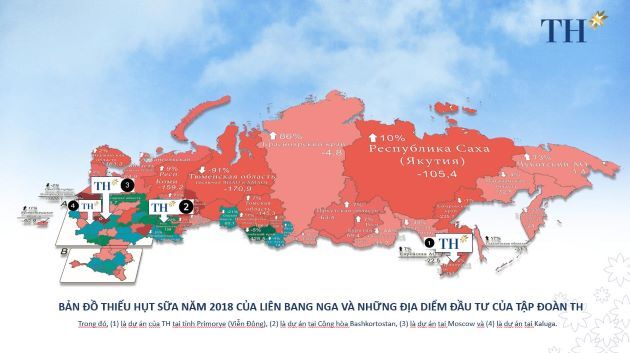 Dự án sữa của TH tại Nga được triển khai theo 3 giai đoạn. Giai đoạn 1 đã tiến hành xây dựng trang trại, nhà máy tại tỉnh Moscow và tỉnh Kaluga. Giai đoạn tiếp theo sẽ có các dự án tại Cộng hòa Bashkortostan và vùng Viễn Đông. Sau đó có thể mở rộng tùy vào thực tế sản xuất, kinh doanh và phát triển thị trường. Khi hoàn thành Dự án ở giai đoạn 3, tổng số đàn bò dự kiến là: 350.000 con, tổng công suất chế biến sữa là 5.900 tấn/ngày, tương đương gần 1.800.000 tấn/năm, tổng diện tích vùng nguyên liệu tập trung là 140.000 ha. Sản phẩm sữa TH true MILK dự kiến phân phối tại nước Nga qua các kênh truyền thống, siêu thị và TH true mart (300 cửa hàng) |