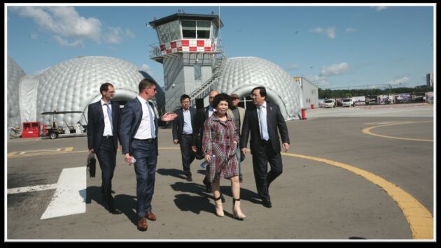 Bà Thái Hương cùng nguyên Đại sứ Việt Nam tại Nga ra trực thăng trong lần đầu bay ở Moscow khảo sát khu vực lập trang trại nuôi bò sữa.