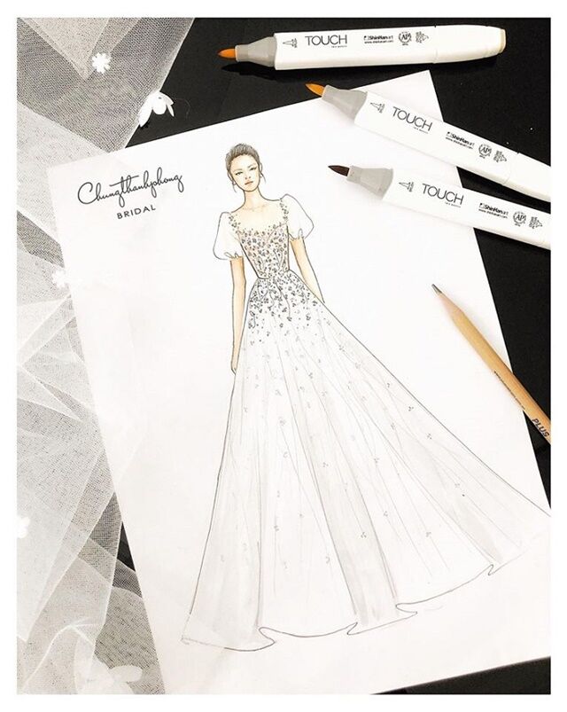 Sau khi đọc được status này của NTK Chung Thanh Phong, cư dân mạng đã đoán ngay đây chính là mẫu váy cưới dành cho Nhã Phương. Chiếc váy được thiết kế tay bồng, chân váy thả dáng tự nhiên. Họa tiết của váy cũng được đính từ vai xuống dưới eo. Nhiều chi tiết dưới chân váy tạo nên một sự hài hòa, giống như một dải sao lấp lánh.