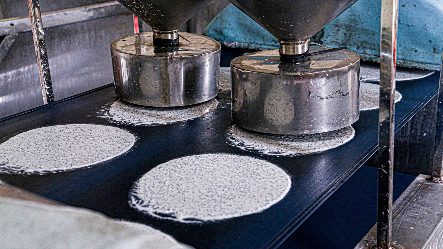Là công đoạn quan trọng nhất để cho ra sản phẩm, việc tráng bánh được HTX Nguyên Lâm thực hiện hoàn toàn thủ công với sự tập trung cao độ của các nhân công. Bằng đôi bàn tay khéo léo cùng sự tỉ mỉ, cẩn thận, công đoạn này phải thật sự cẩn thận để tránh làm bánh bị rách hoặc méo. Thành phẩm cuối cùng chính là bánh tráng sau khi phơi khô sẽ được nướng chín qua hệ thống sấy tự động để đảm bảo độ chín, giòn đều.