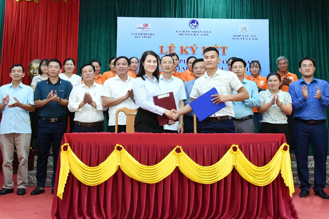 Đại diện HTX Nguyên Lâm và Siêu thị Co.opmart Hà Tĩnh ký kết tiêu thụ sản phẩm