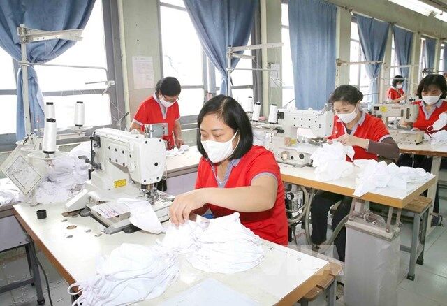 Công nhân Xí nghiệp may 1, Công ty Cổ phần May Chiến Thắng sản xuất khẩu trang vải dệt kim kháng khuẩn. Ảnh: TTXVN