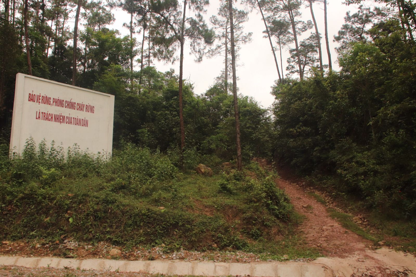 Trục đường chính đi vào nơi xảy ra vụ chặt phá rừng. Khẩu hiệu bên ngoài trái ngược hẳn với những gì đang diễn ra bên trong
