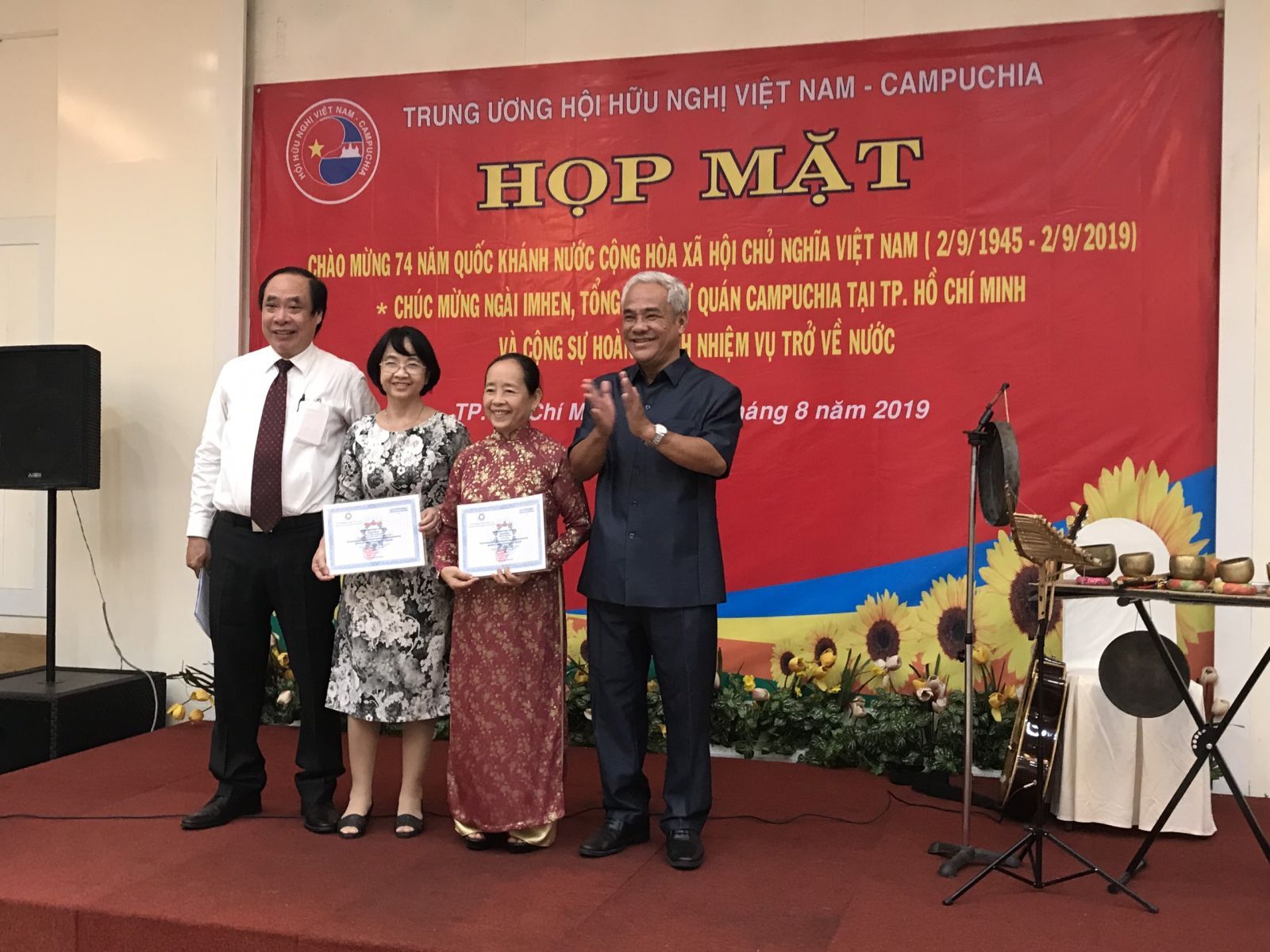 Ngài IMHEN (bìa trái) - Tổng lãnh sự campuchia cùng TS. Lê Hồng Liêm trao Bằng khen của Phó Thủ tướng Vương quốc Campuchia cho các thành viên Hội Hữu nghị VN-CPC có nhiều đóng góp cho sự phát triển của 2 Hội.