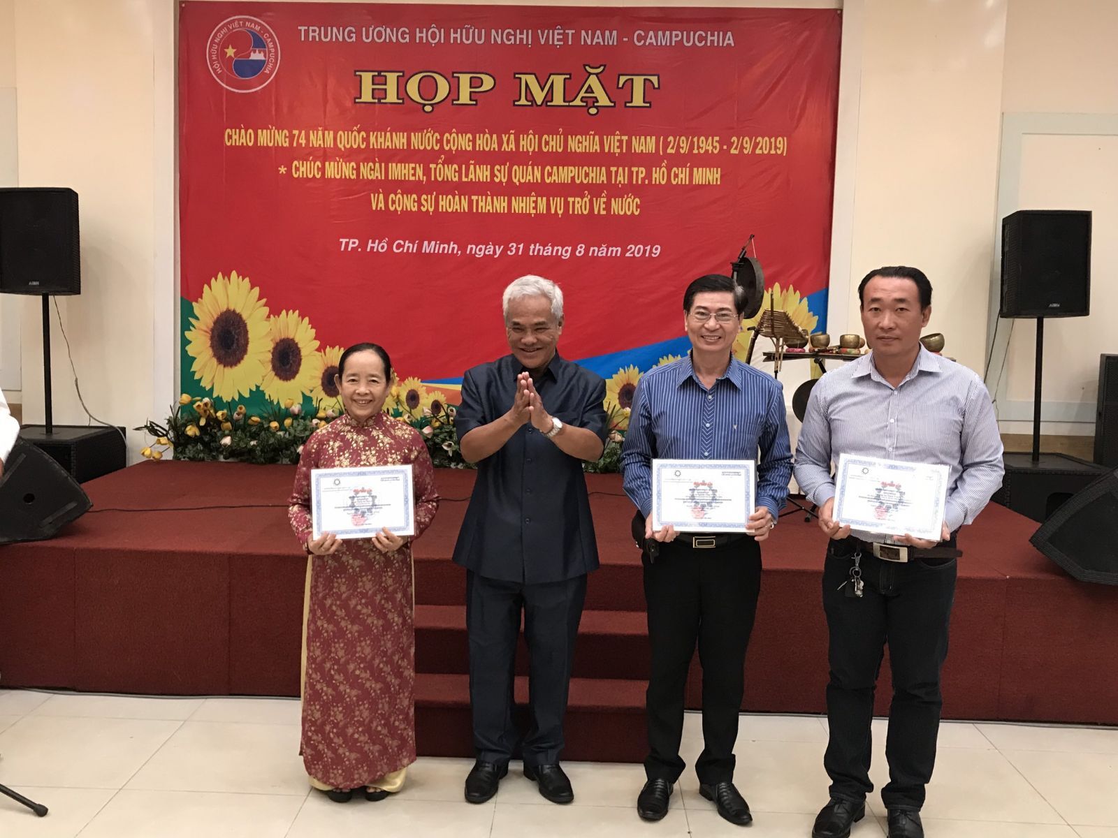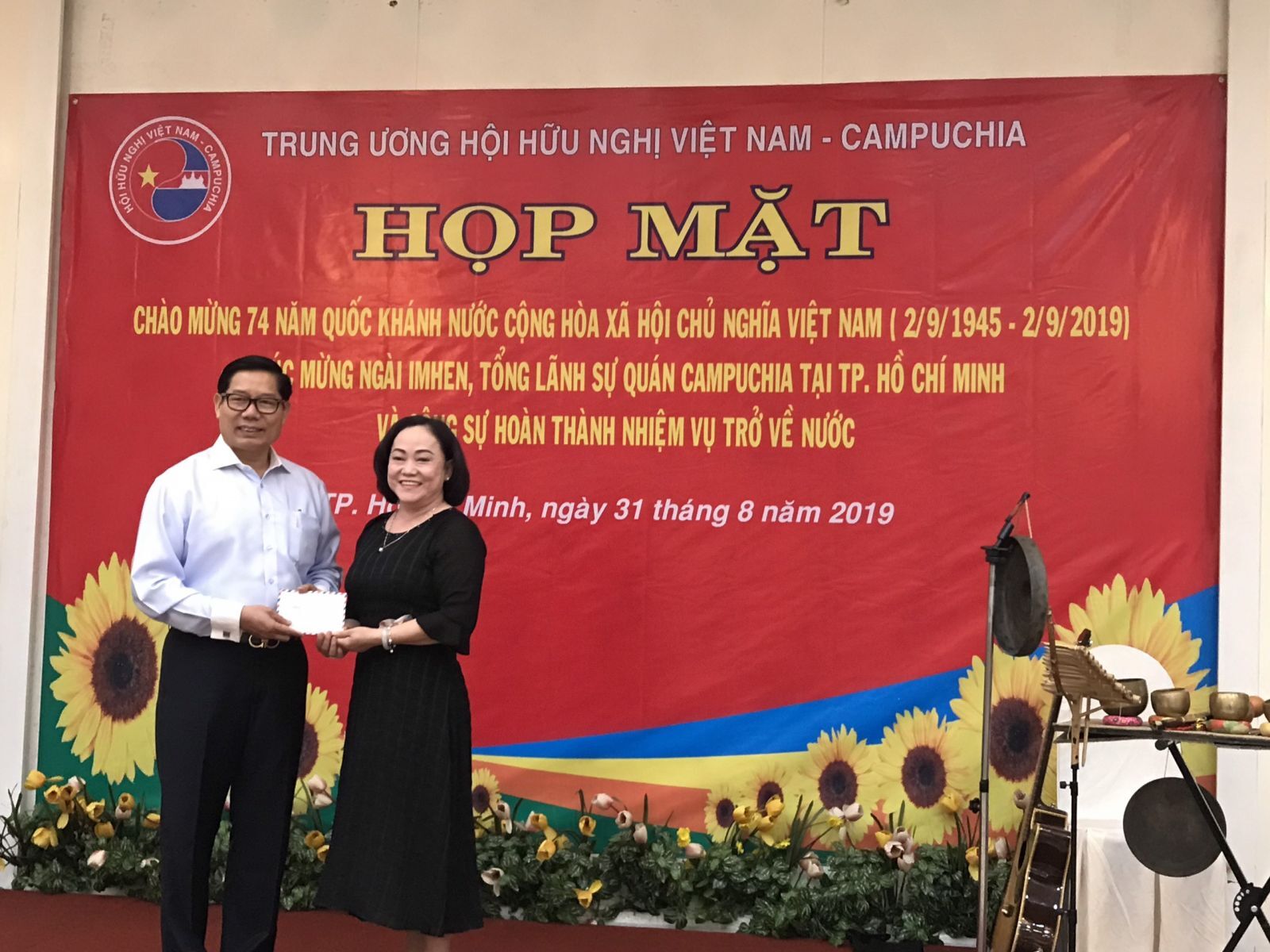 Phát biểu tại Buổi họp mặt, Ngài IMHEN - Tổng lãnh sự Campuchia tại TP. HCM, chia sẻ: Tôi rất là xúc động khi được mời dự buổi họp mặt chia tay hôm nay, tôi cũng rất trân trọng những kỹ niệm đẹp giữa Tổng lãnh sự Campuchia với Trung ương Hội Hữu nghị Việt Nam-Campuchia; Trung ương Hội cũng như Hội TP. HCM thường xuyên trao đổi đoàn tham quan, thể hiện sự quan tâm của 2 Trung ương Hội là Hội Hữu nghị Việt Nam -Campuchia và Hội Hữu nghị Campuchia-Việt Nam thường xuyên trao đổi thông tin với nhau, có những phương hướng hành động hỗ trợ và giúp đỡ lẫn nhau, và cũng nhau giải quyết những vấn đề còn tồn đọng; Gần đây, Trung ương Hội VN-CPC đã tham gia vận động, đỡ đầu được thêm 20 em lưu học sinh Campuchia.