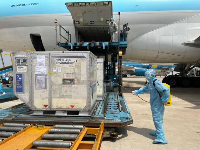 Phun khử trùng lô vaccine ngay sau khi vận chuyển xuống sân bay. Ảnh: Bộ Y tế