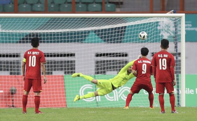 Ít phút sau pha lập công của Quang Hải, chính anh đã góp công kiếm về một quả penalty cho Việt Nam. Cơ hội được trao cho Công Phượng nhưng không may, cú sút của tiền đạo CLB Hoàng Anh Gia Lai lại dội trúng xà ngang.