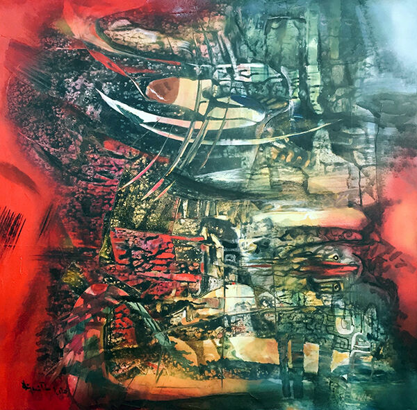Đây là cuộc triển lãm thứ hai của ông ngay trong năm “dịch bệnh” 2020 đầy ấn tượng, với 15 tác phẩm được thể hiện trên các chất liệu acrylic và sơn mài, như: Cửa khép hờ, Những đôi mắt hóa thạch, Cái bóng mờ, Xóm biển, Tiếng xưa…