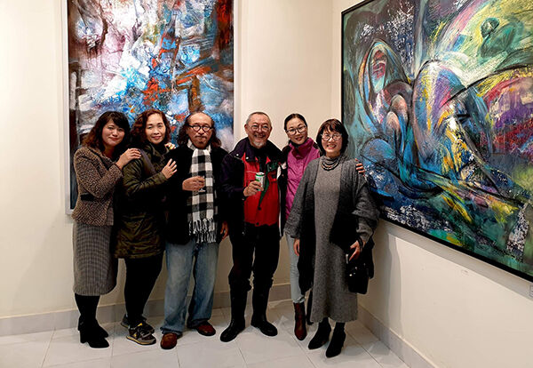 Họa sĩ Đặng Mậu Tựu (thứ ba bên trái sang) cùng những người bạn khai mạc phòng tranh.