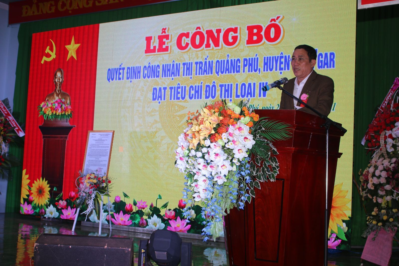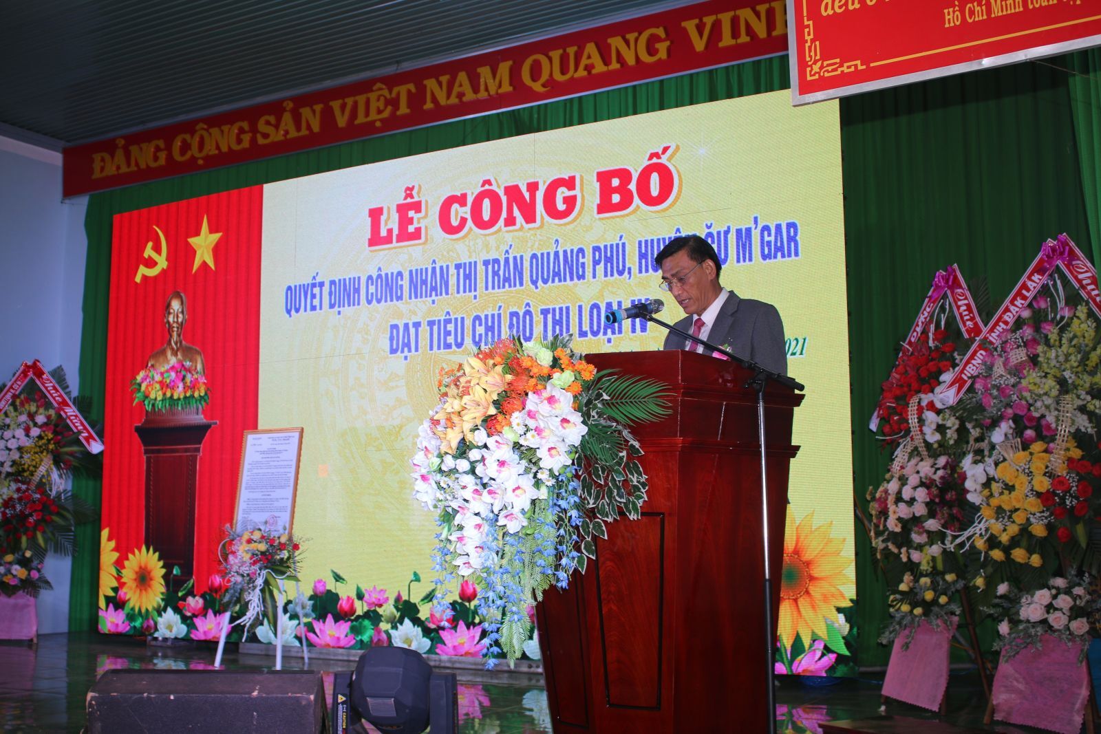 Phát biểu tại buổi lễ, ông Võ Văn Cảnh, Phó chủ tịch UBND tỉnh Đắk Lắk cho biết: “Thay mặt UBND tỉnh tôi xin nhiệt liệt chúc mừng Đảng bộ, chính quyền và nhân dân thị trấn Quảng Phú, nhân sự kiện có ý nghĩa quan trong này đồng thời cũng ghi nhận và đánh giá cao sự cố gắng, nỗ lực, đồng lòng của cấp uỷ Đảng, chính quyền và nhân dân địa phương trong xây dựng cơ sở, hạ tầng đô thị , cùng những kết quả đạt được trên lĩnh vực kinh tế - xã hội. Việc thị trấn Quảng Phú được công nhận là đô thị loại IV sẽ là cơ sở, điều kiện để định hướng phát triển, nâng cấp đô thị theo các tiêu chí cao hơn, hình thành nên đô thị văn minh, hiện đại với cuộc sống tốt đẹp, tiện nghi hơn cho toàn thể cư dân đô thị…”