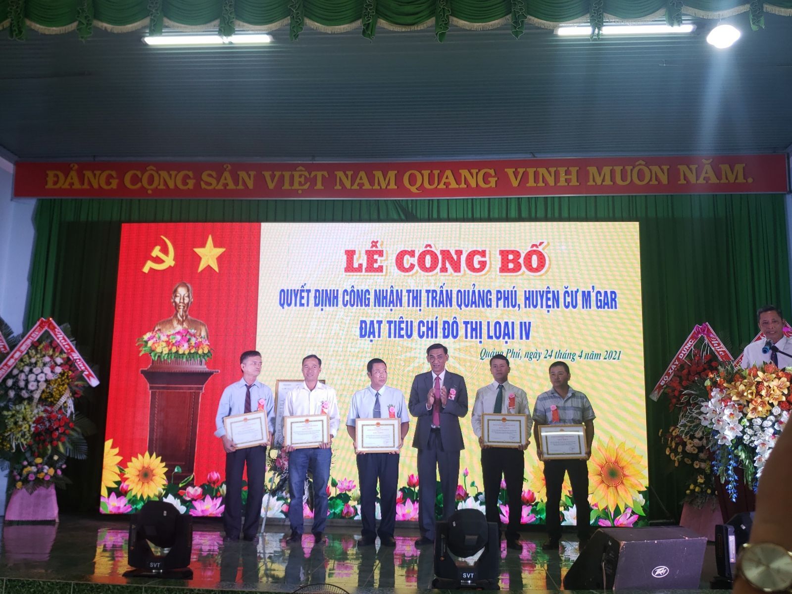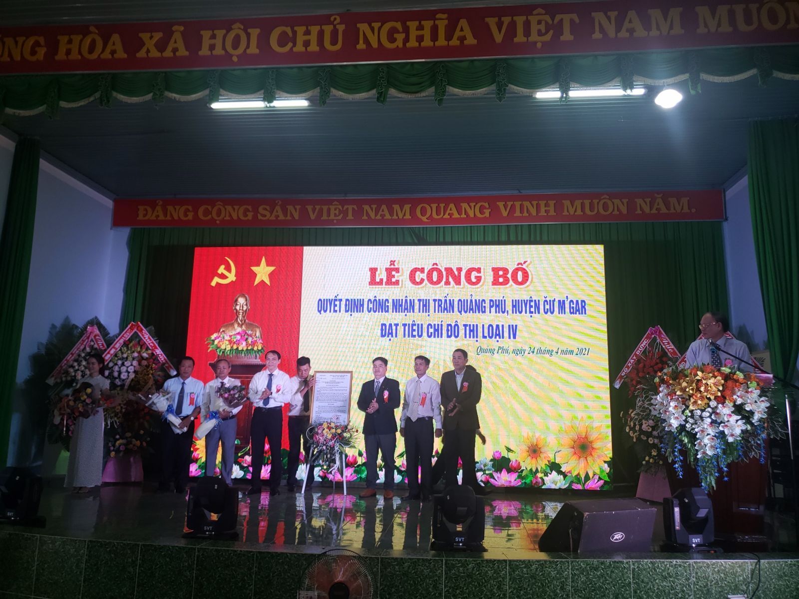 Sáng ngày 24/4, tại hội trường UBND thị trấn Quảng Phú huyện Cư M’gar đã diễn ra Lễ công bố quyết định công nhận thị trấn Quảng Phú đạt tiêu chí đô thị loại IV.