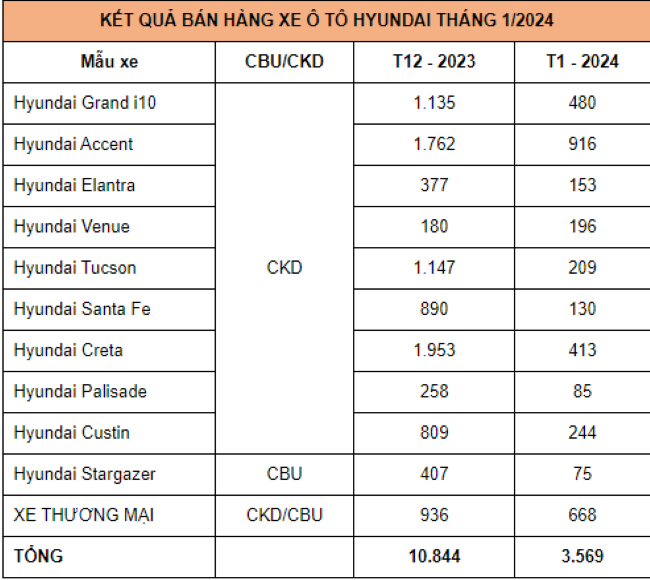 Tháng 1 năm 2024 là thời điểm cận dịp Tết nguyên đán, gây nên tâm lí hạn chế mua sắm với khách hàng, dẫn đến doanh số của Hyundai nói riêng cũng như toàn thị trường nói chung suy giảm. Khi qua thời gian nghỉ Tết, thị trường được ổn định trở lại sẽ mang kì vọng vào mức doanh số tăng trưởng cao hơn trong các tháng kinh doanh tiếp theo.