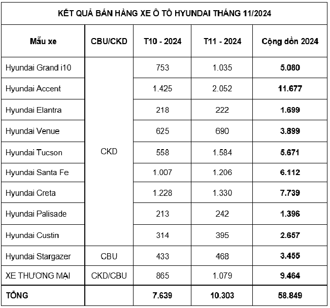 Hyundai Accent tiếp tục là mẫu xe có số lượng bán hàng tốt nhất tháng 11 với 2.052 xe, tăng trưởng 44% so với tháng 10. Hyundai Tucson đứng ở vị trí thứ 2 với số bán ở mức 1.584 xe, tăng trưởng gần 3 lần so với tháng trước. Hyundai Creta ghi nhận doanh số 1.330 xe bán ra, tăng trưởng 8,3% so với tháng 10, đứng ở vị trí thứ 3.