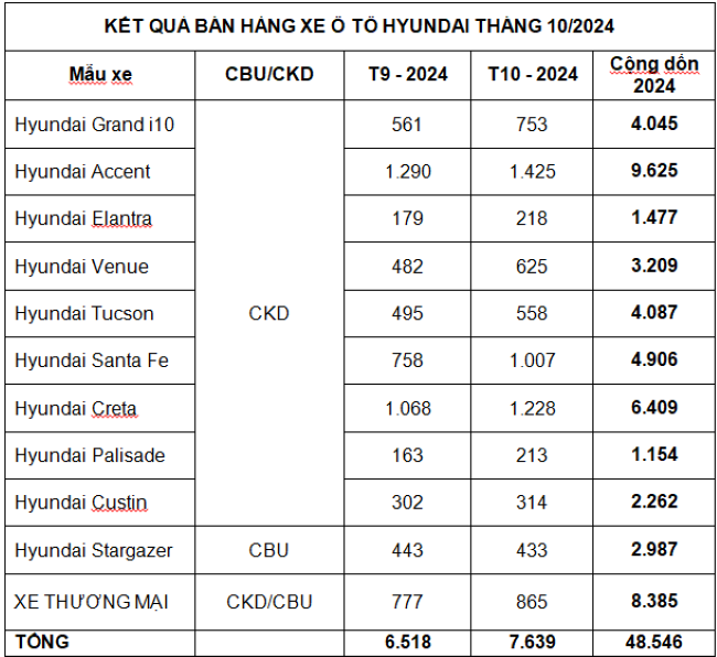 Hyundai Grand i10 ghi nhận mức doanh số đạt 753 xe, tăng trưởng 34,2% so với tháng 9. Hyundai Venue đứng ở vị trí thứ 5 với doanh số 625 xe, tăng trưởng 29,7%. Hyundai Tucson ghi nhận doanh số 558 xe, tăng trưởng 12,7% và Hyundai Stargazer đứng ở vị trí thứ 7 đạt 433 xe.