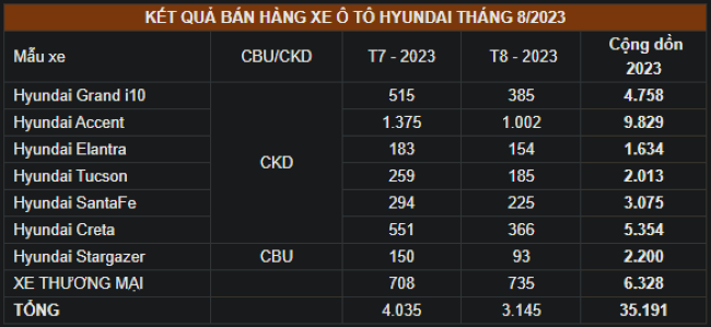 Hyundai Santa Fe đứng thứ 4 với số bán đạt 225 xe. Hyundai Tucson với 185 xe bán ra đứng ở vị trí thứ 5. Hyundai Elantra đứng thứ 6 với 154 xe bán ra. Hyundai Stargazer khép lại tháng 8 với số bán đạt 93 xe. Các mẫu xe thương mại Hyundai đạt doanh số 735 xe bán ra trong tháng 8/2023.