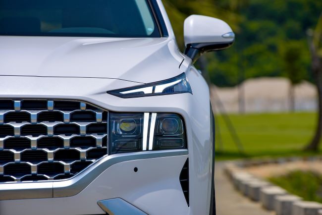 New Santa Fe được trang bị đèn pha Adaptive LED thích ứng tự động (AHB-LED) cùng công nghệ Full-LED, đem tới khả năng chiếu sáng thông minh và hiệu quả. Cụm đèn được thiết kế đặt ngang và cao hơn so với cách đặt dọc và thấp của bản tiền nhiệm.