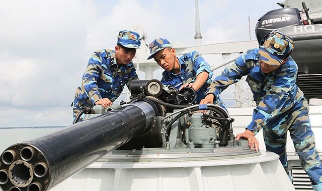 Cán bộ, chiến sĩ Lữ đoàn 167, Vùng 2 (Quân chủng Hải quân) thực hiện nhiệm vụ bảo dưỡng pháo AK-630 trên Tàu 337