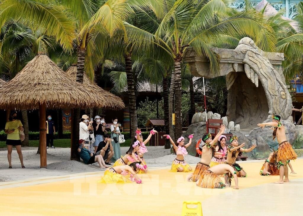 Khách quốc tế xem trình diễn Vũ điệu Hawaii tại Công viên nước (Vinwonders Phú Quốc), tỉnh Kiên Giang. Ảnh: TTXVN