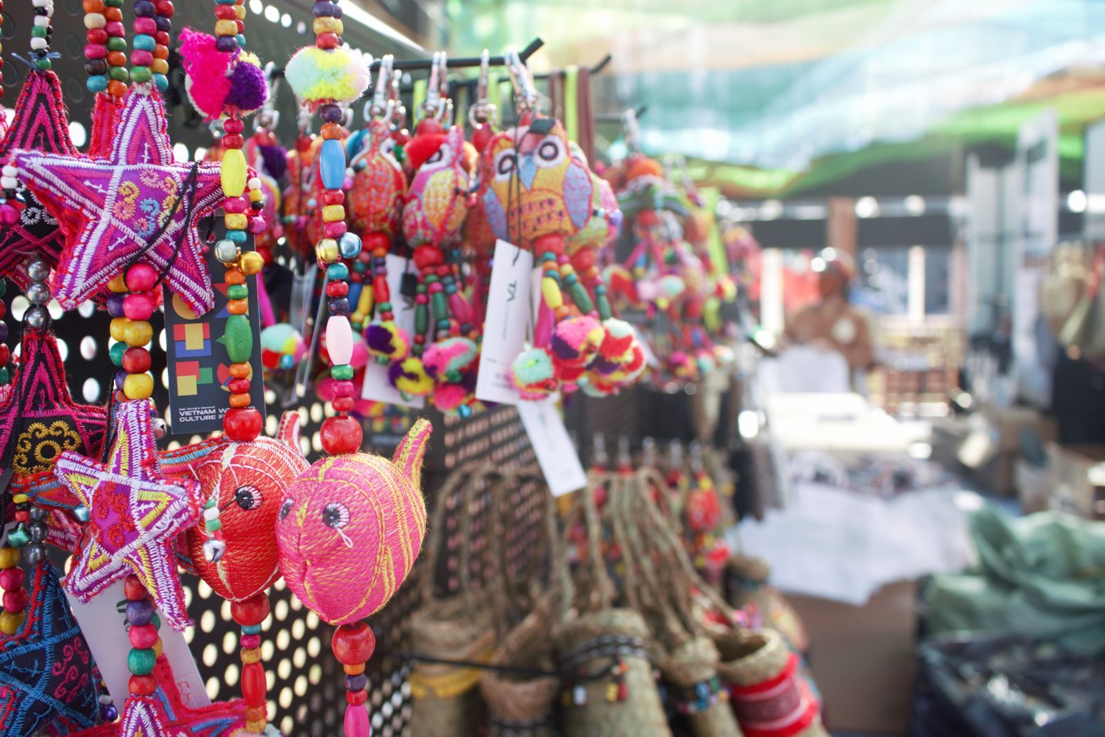 Trưng bày đồ vật được làm bằng thổ cẩm, lung linh đủ sắc màu.