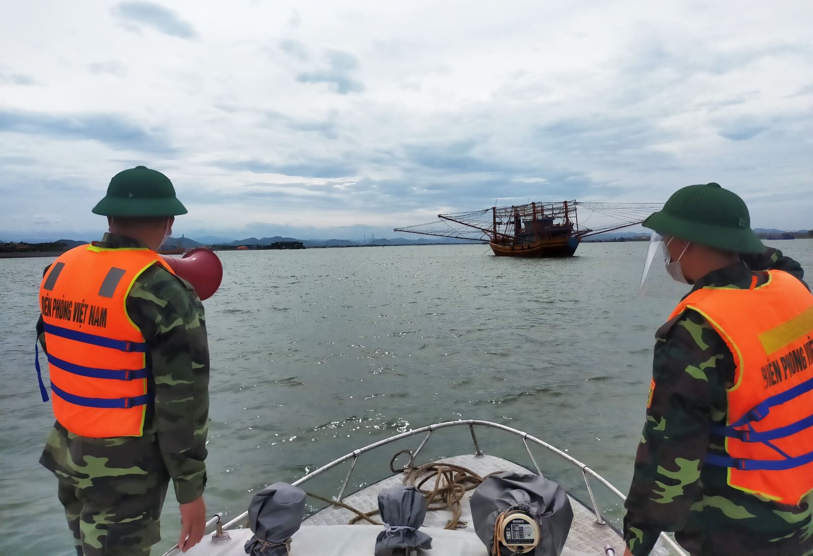 Cán bộ chiến sỹ Biên phòng Quảng Bình kêu gọi, hướng dẫn tàu, thuyền vào neo đậu tại bến thuyền, cảng cá đảm bảo an toàn. Ảnh: TTXVN
