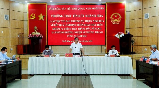 Ngày 1/10, Thường trực tỉnh Uỷ Khánh Hòa đã có buổi làm việc với Ban Thường vụ Thị ủy Ninh Hòa về kết quả lãnh đạo triển khai thực hiện nhiệm vụ chính trị 9 tháng qua, và phương hướng, nhiệm vụ những tháng cuối năm 2021.