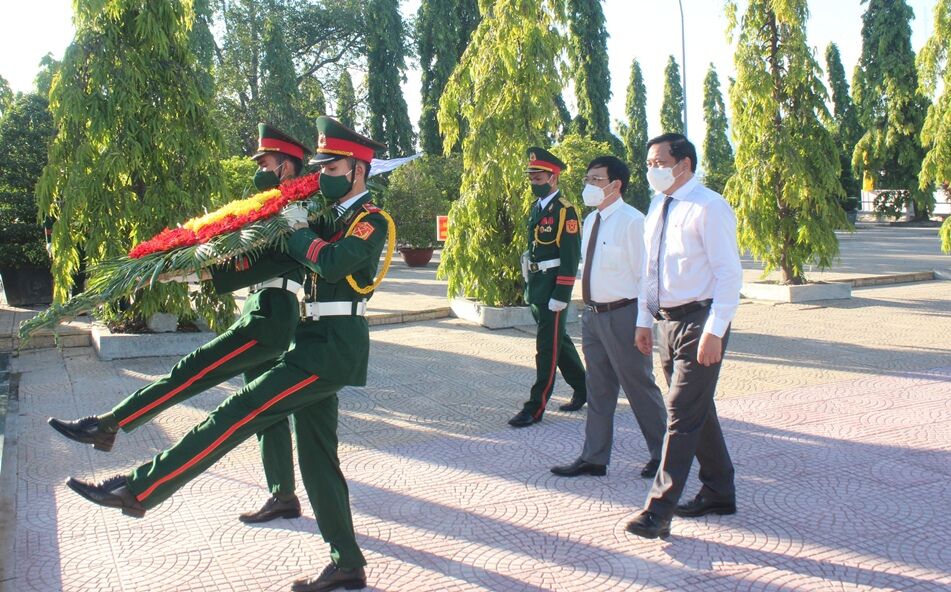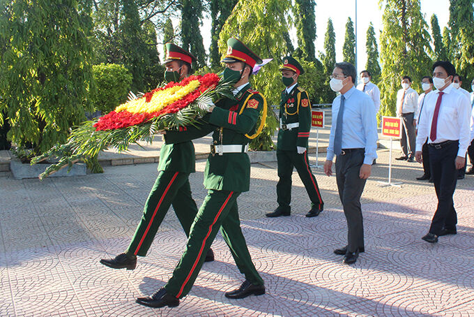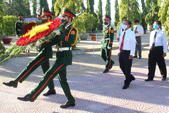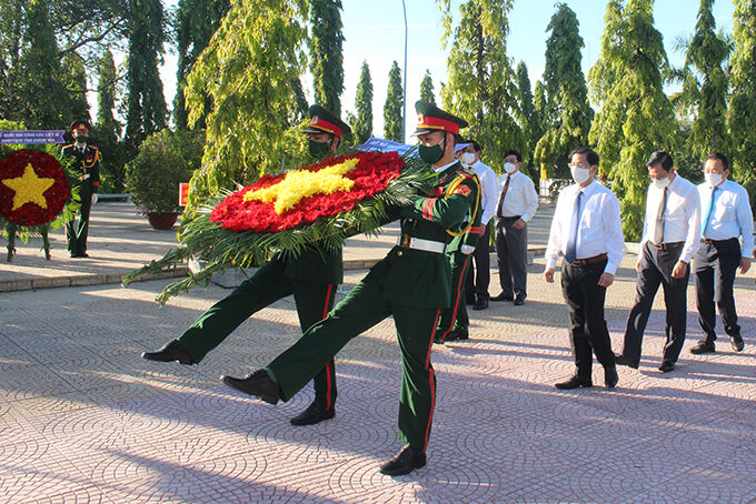 Đoàn đại biểu HĐND, UBND tỉnh do đồng chí Nguyễn Tấn Tuân - Phó Bí thư Tỉnh ủy, Chủ tịch UBND tỉnh dẫn đầu, vòng hoa mang dòng chữ: “Đời đời nhớ ơn các Anh hùng liệt sĩ”..(ảnh:BKH)
