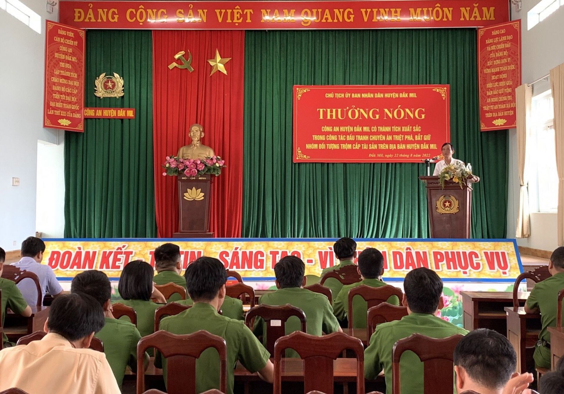 Thay mặt lãnh đạo huyện, Chủ tịch UBND huyện Đắk Mil, ông Nguyễn Ngọc Lũy đã chúc mừng, ghi nhận, biểu dương và đánh giá cao tinh thần trách nhiệm, mưu trí, sáng tạo của, bên cạnh đó là tinh thần khẩn trương xác minh điều tra CBCS Công an huyện Đắk Mil trong việc khám phá nhanh nhóm đối tượng chuyên trộm cắp tài sản, xác định tài sản mất để trả lại cho người bị hại, cũng như đem lại sự bình yên trong Nhân dân.