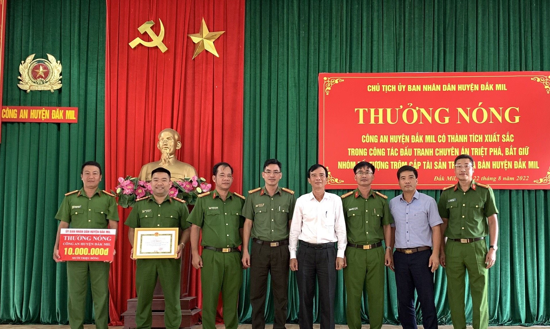 Tại buổi trao thưởng, Trưởng Công an huyện Đắk Mil, Thượng tá Dương Văn Mạnh, cho biết, dưới sự chỉ đạo trực tiếp của Ban Giám đốc Công an tỉnh và huyện ủy, UBND huyện, cùng sự chủ động, tích cực của mỗi CBCS, chỉ trong thời gian ngắn xác lập chuyên án, lực lượng Công an huyện Đắk Mil đã đấu tranh, triệt phá 1 nhóm 4 đối tượng thực hiện 17 vụ trộm cắp tài sản với 17 chiếc xe máy các loại trên địa bàn 2 huyện Đắk Mil và Đắk Song với tổng giá trị tài sản trên 120 triệu đồng.