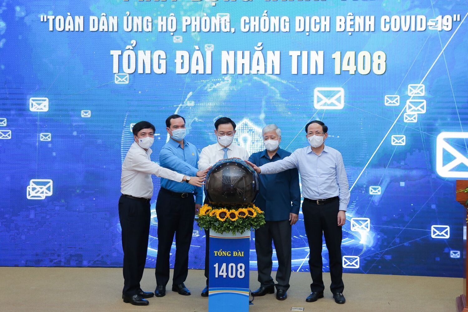 Chủ tịch Quốc hội Vương Đình Huệ cùng các lãnh đạo MTTQVN, Tổng LĐLĐVN, Bộ Thông tin và Truyền thông khởi động chương trình nhắn tin "Toàn dân ủng hộ phòng, chống dịch bệnh COVID-19". Ảnh: PVI