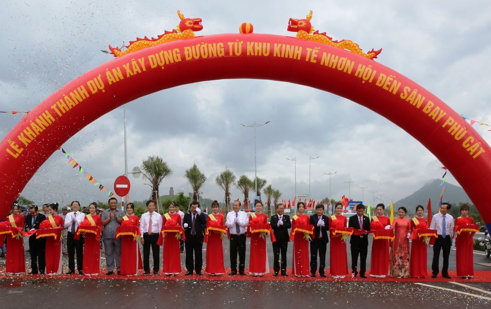 Phó Thủ tướng Thường trực Chính phủ Trương Hòa Bình cùng các đại biểu cắt băng khánh thành tuyến đường từ Khu kinh tế Nhơn Hội đến sân bay Phù Cát, Bình Định. Ảnh: VGP/Mạnh Hùng