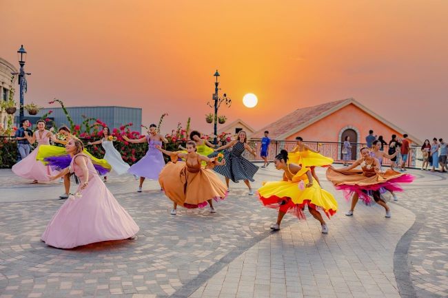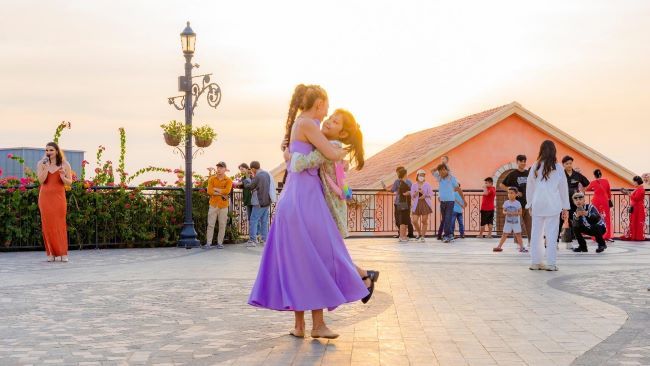 Du khách có thể đi dạo trên những con phố mang phong cách Địa Trung Hải đầy màu sắc, check-in với loạt công trình kiến trúc biểu tượng như đài phun nước King of the Sun, tháp đồng hồ Central Village, “bảo tàng nghệ thuật” Sun Signature Gallery… Khi hoàng hôn nhuộm vàng thị trấn trong ánh chiều tà, thị trấn và những công trình biểu tượng tạo nên một bức tranh đẹp mê hoặc. Dù cây Cầu Hôn chưa chính thức ra mắt, nhưng đi dạo trên con đường thơ mộng bên biển, bạn vẫn có thể ngắm nhìn tuyệt phẩm kiến trúc đang hứa hẹn tạo nên một biểu tượng mới không chỉ cho Phú Quốc mà cho cả Việt Nam.