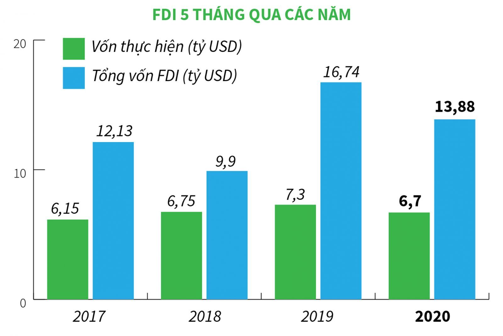 FDI 5 tháng qua các năm. Nguồn: Bộ KH-ĐT