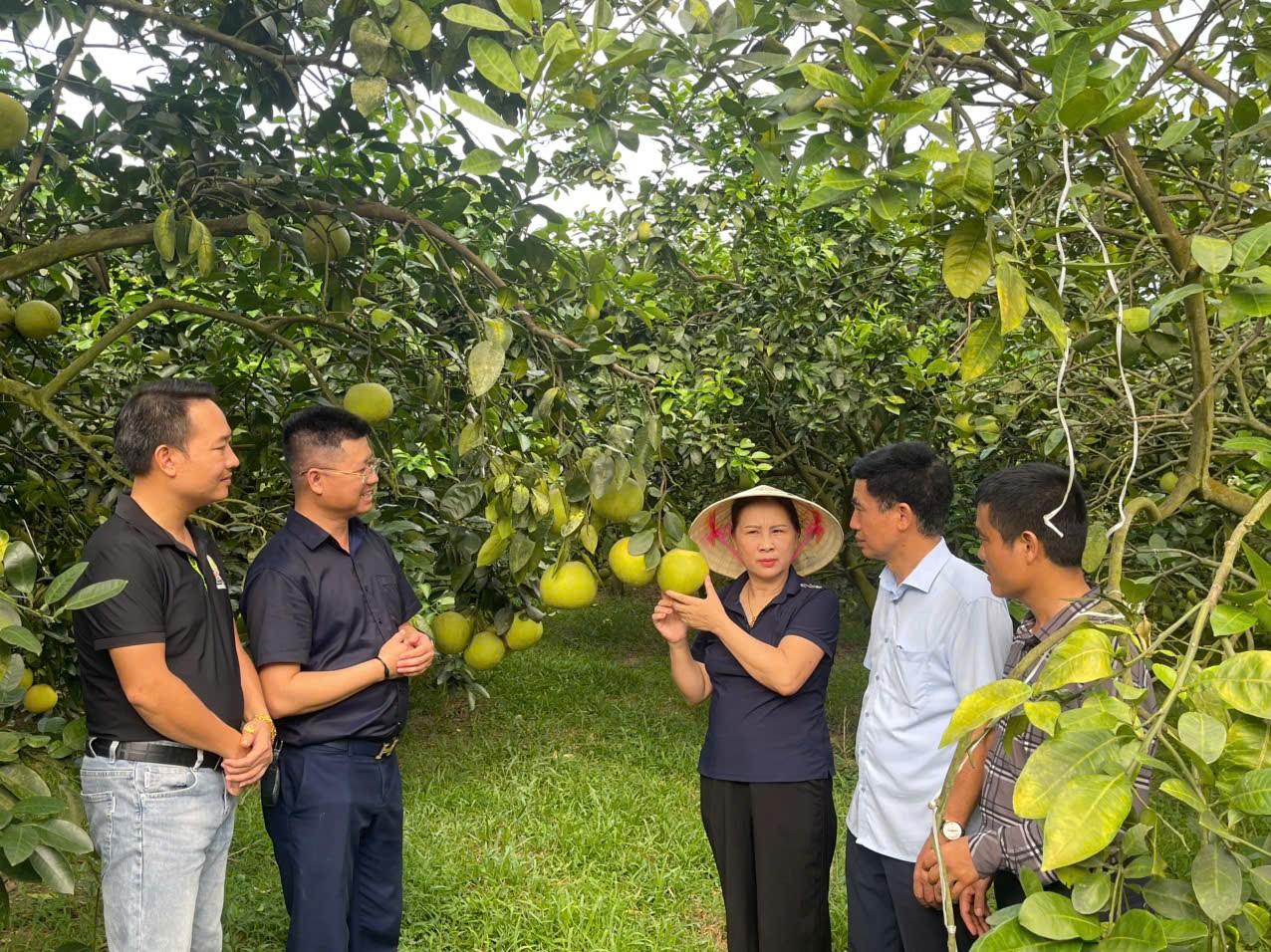 Vườn bưởi hữu cơ tại xã Phúc Trạch được cấp chứng chỉ liên tục nhiều năm nay. (Giám đốc Trung tâm khuyến nông Nguyễn Hữu Ngọc thứ 2 bên trái sang)