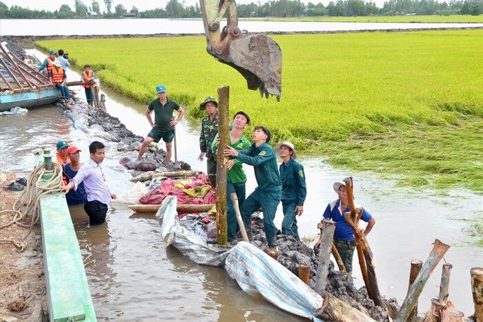 Trước đó, do thời tiết mưa nhiều, mực nước dâng cao, hệ thống bờ bao của gia đình ông An Văn Khiêm, ngụ ấp Cỏ Quen, xã Phú Lợi bị sụt lún, nhiều chỗ nước bắt đầu tràn bờ chảy vào ruộng, nguy cơ vỡ bờ bao, gây ngập hoàn toàn 30 công lúa gần đến ngày thu hoạch.