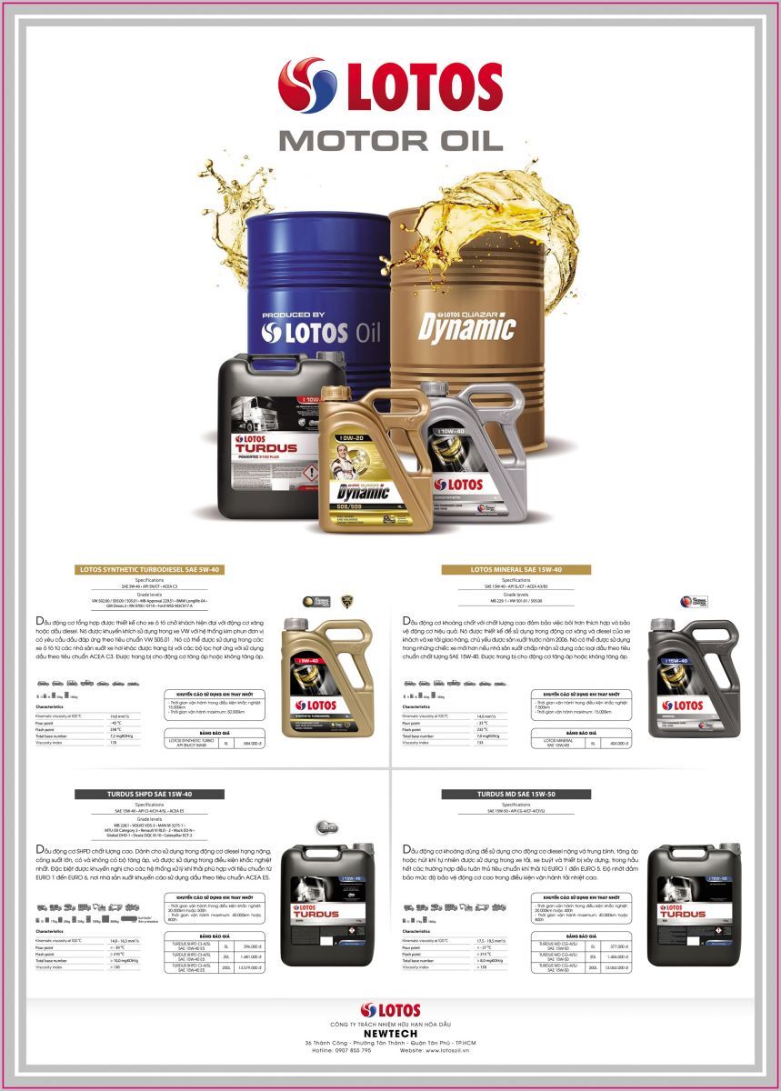 LOTOS OIL cung cấp một loạt các sản phẩm có thông số công nghệ cao nhất cho ngành công nghiệp ô tô và máy móc. Nhưng hoàn toàn phù hợp với khuyến nghị của nhà sản xuất động cơ. Các dòng sản phẩm chính bao gồm dầu tổng hợp cao cấp LOTOS Quazar, dầu tổng hợp LOTOS với công thức kiểm soát nhiệt, một loạt các loại dầu khoáng và bán tổng hợp cho xe khách. Ngoài ra, ưu đãi của LOTOS Oil bao gồm một loại dầu khoáng Turdus, bán tổng hợp và dầu tổng hợp dành riêng cho xe tải và xe chuyên dùng.