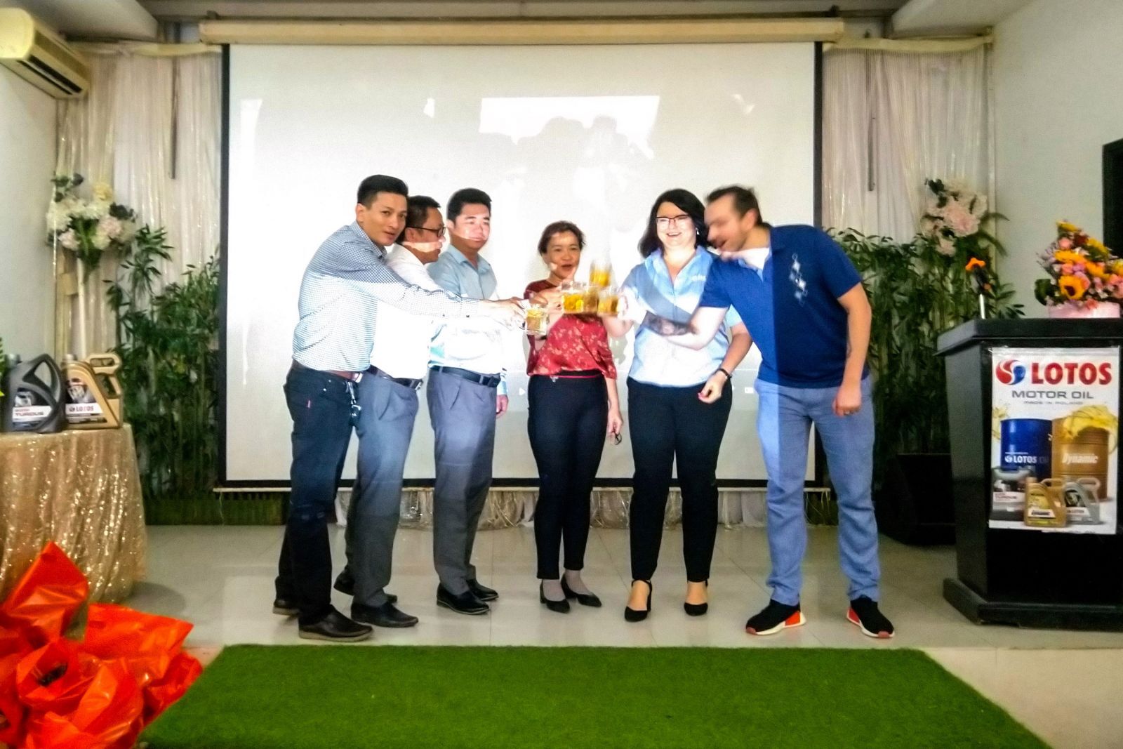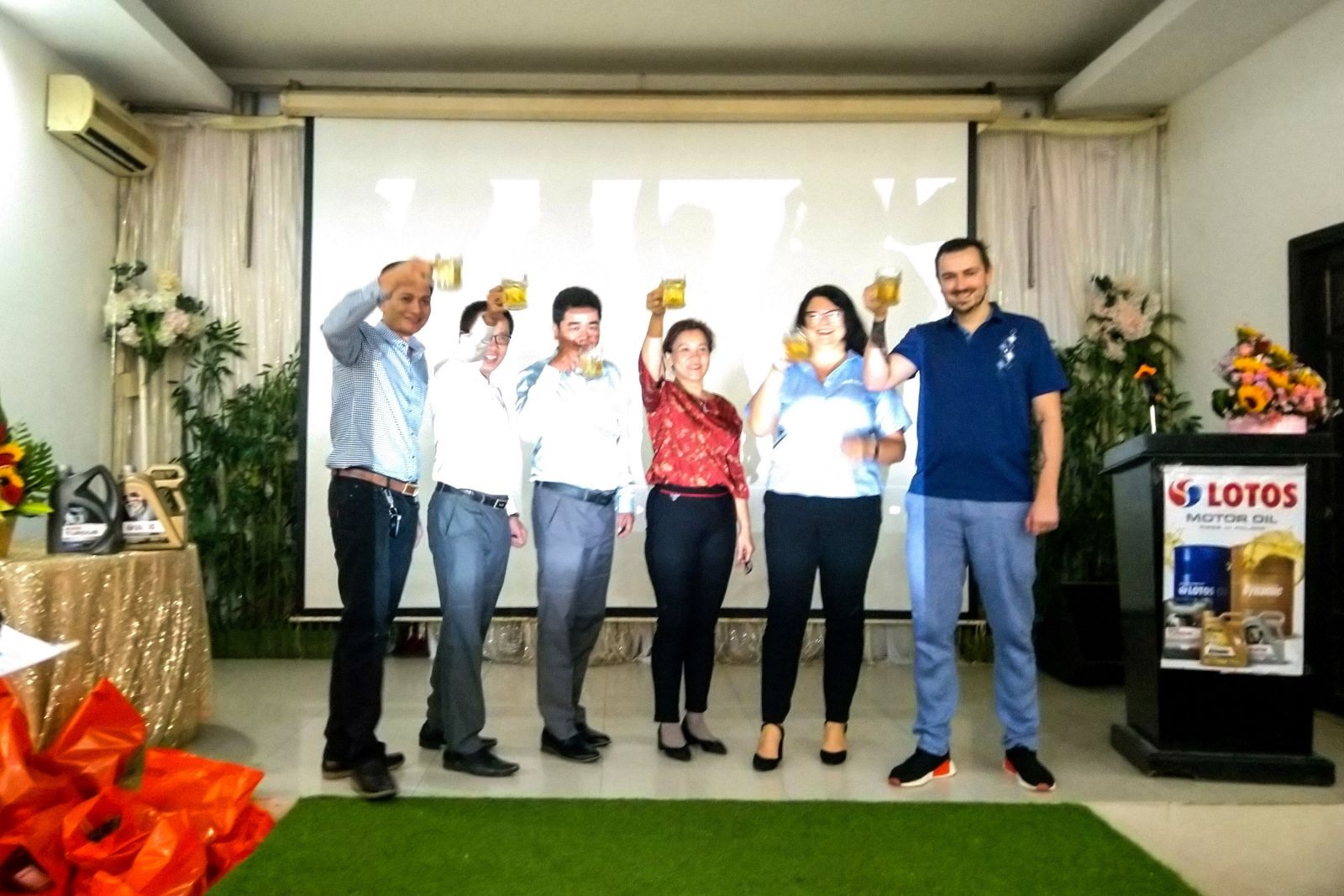 Đại diện Tập đoàn Lotos Oil Ba Lan (đầu tiên bên phải), Lotos Oil Việt Nam ông Nguyễn Quang Chính (đầu tiên bên trái), Đại diện báo Việt Nam Hội Nhập (thứ 3 từ trái sang) và đại diện nhà phân phối tại Kiên Giang nâng ly chúc mừng hội nghị thành công tốt đẹp.