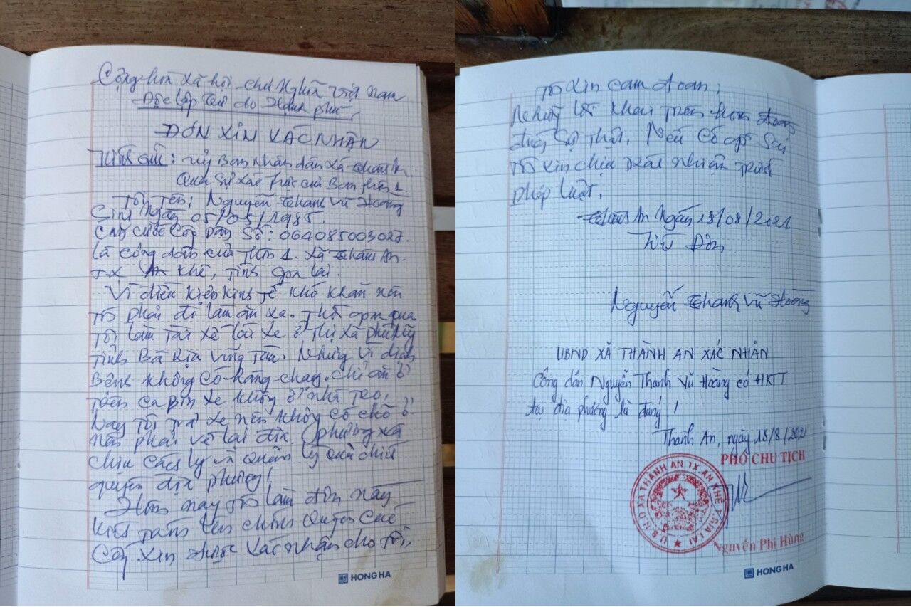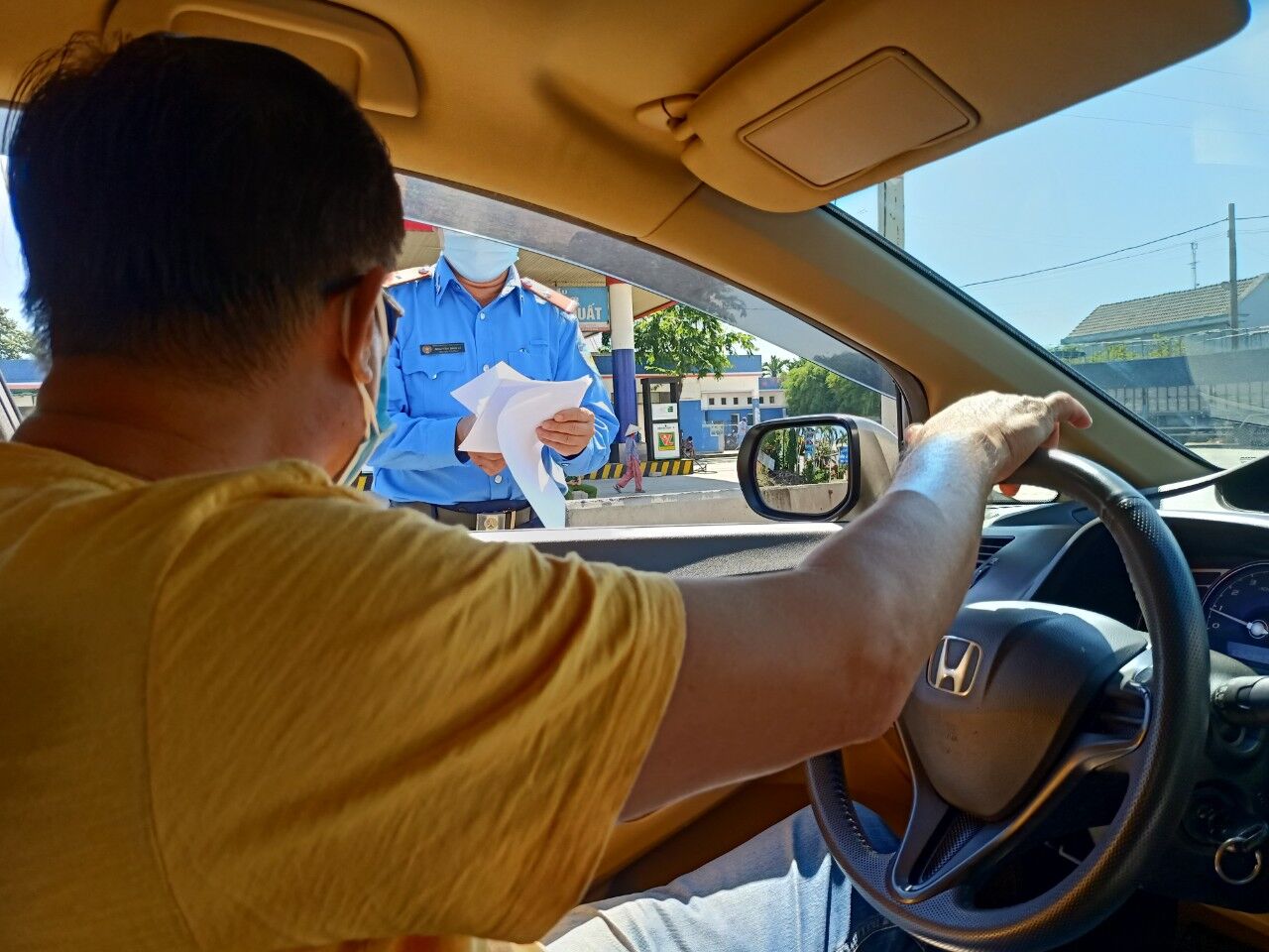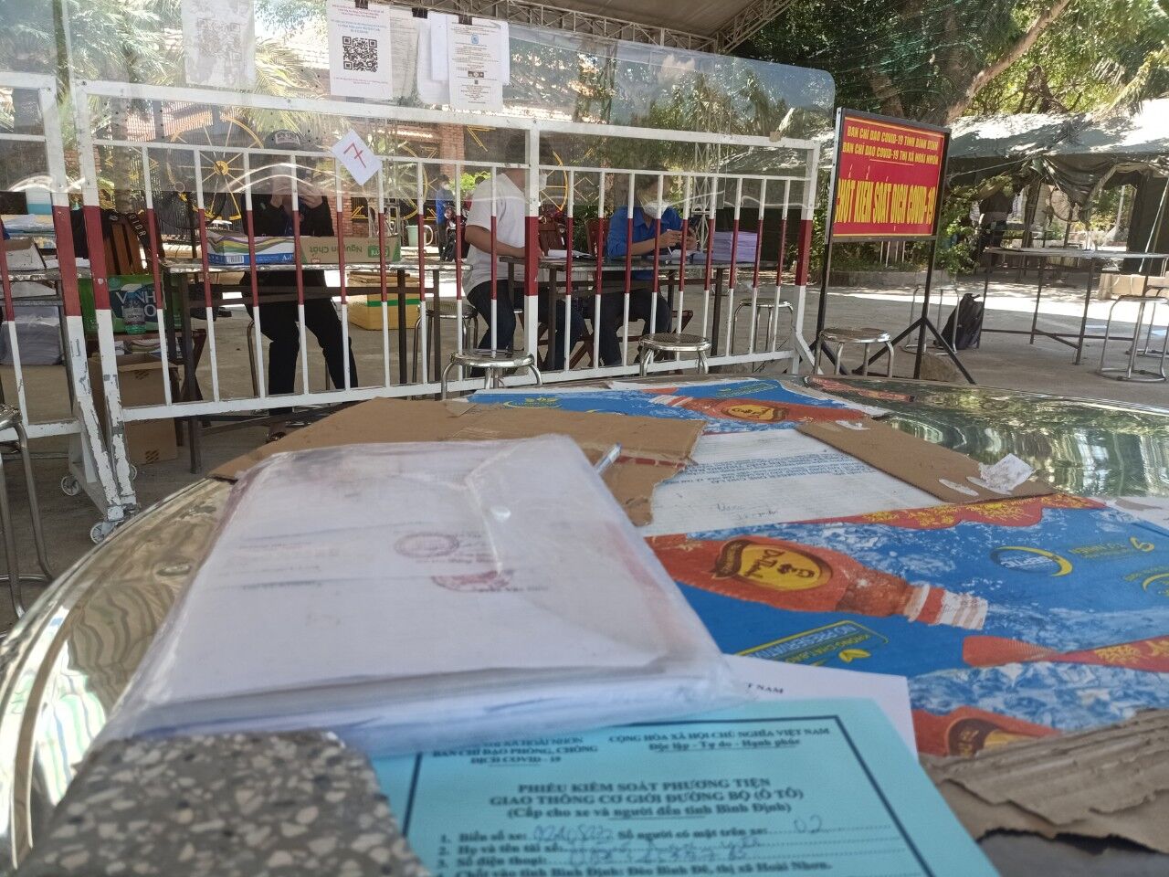 Chốt kiểm soát phòng, chống dịch bệnh Covid-19 tại Bình Định yêu cầu các trường hợp qua chốt điền vào hai tờ khai trắng và xanh.