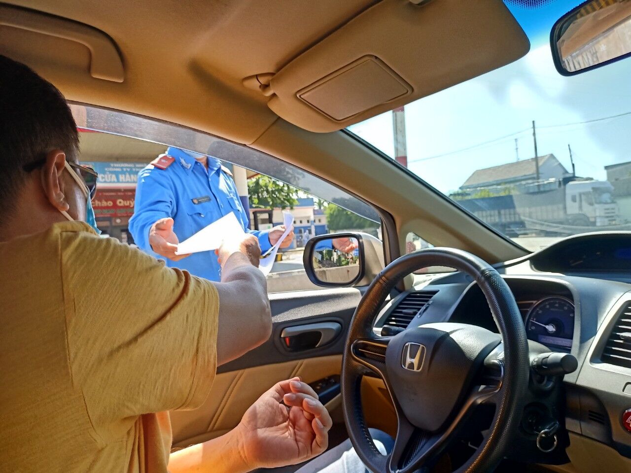 Chốt kiểm soát phòng, chống dịch bệnh Covid-19 tại Quảng Ngãi chỉ khai báo y tế trên xe.